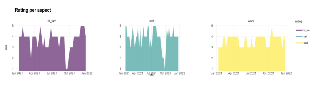 Before it, let’s see the descriptive stats. How I rated these 3 aspects weekly in the span of a year. Wow. Work is relatively stable compared to the other 2 categories friends & family! (Really did not expect). Ok, hypothesis was refuted. Maybe, the external environment is more difficult to control, hence the relatively stable rating. But look at the ratings though! So stable at 3 and above during the whole year, compared to self and friends & family.