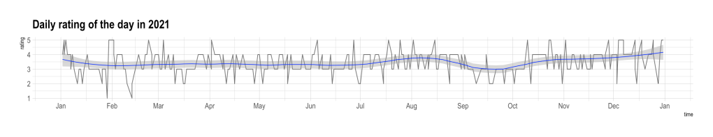 - Work did not correlate that much with my well-beings compared to last year. I’m relatively happy during 2021, so the disturbance (which is more prominent) are coming from myself or relations with others.