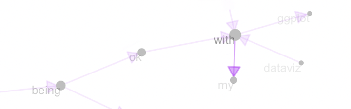 Here comes the network of bigrams with ggraph! I visualized the texts I entered onto these two questions and how two words relate with each other, including the direction. I just learned it yesterday and was extremely helped by the tidytextmining resource for learning.