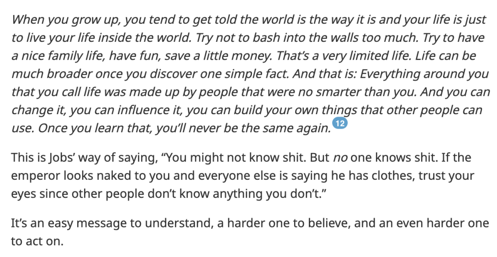 I used to think that people’s opinion can be a guidance on how to approach life. In some sense, yes, but ultimately I need something else: “a map to navigate my life”. And the best map is the one that is drawn by myself. All people have a map, either given (from parents or schools), copying others (looking up to someone popular), or creating and iterating from scratch. Some people are satisfied with the one installed from others, but I would like to create my own. I like to be the chef and not the cook. Learning to code in my course kind of made me relived this Steve Jobs’ quote (also taken from Tim Urban’s waitbutwhy):